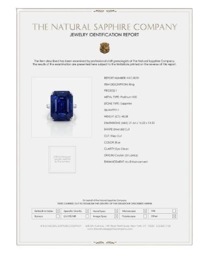 Step into the world of rare, museum-grade gemstones with this breathtaking 48.38-carat Ceylon Blue Sapphire, masterfully cut in an elegant emerald shape and set in premium Platinum 950. Sourced from the legendary gem mines of Sri Lanka, this sapphire showcases an extraordinary royal-blue hue—vibrant, luxurious, and full of life.