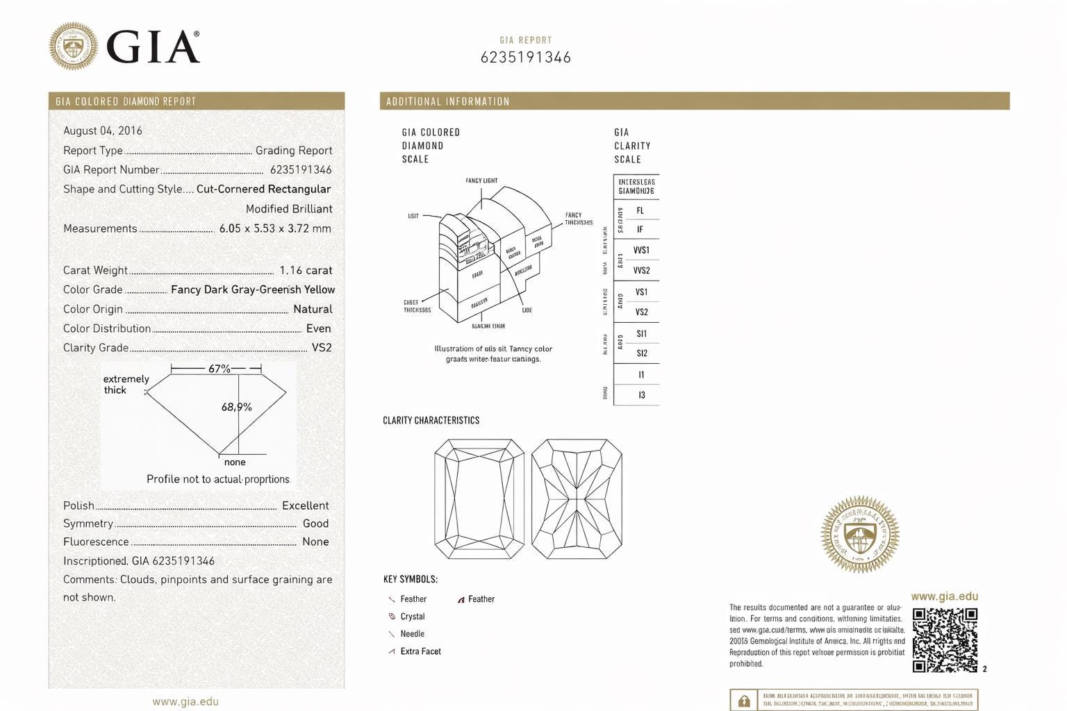Presenting an extraordinary GIA Certified Natural Fancy Color Diamond Ring, crafted for collectors, connoisseurs, and those seeking a truly rare statement piece. This elegant ring features a 1.16 carat natural fancy dark gray-greenish yellow diamond, graded and authenticated by the Gemological Institute of America (GIA)—the world’s most trusted authority in diamond certification.
