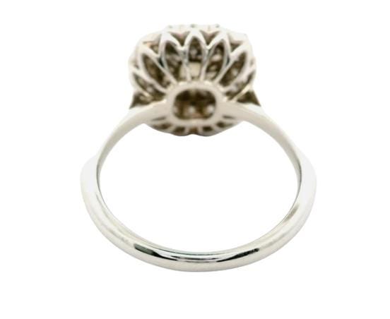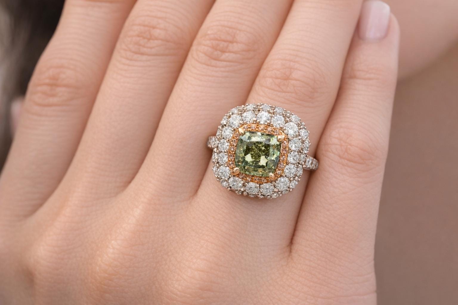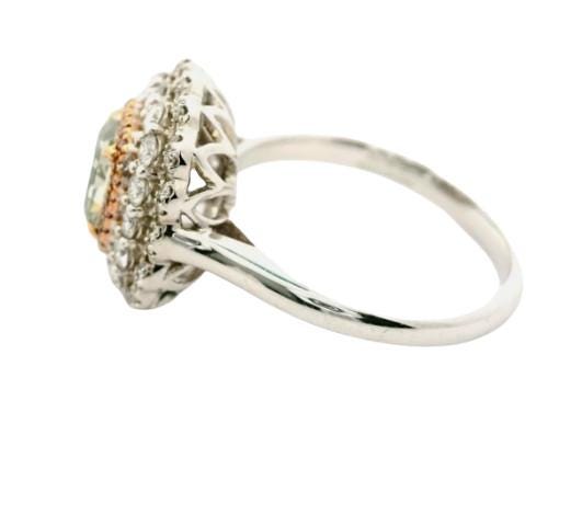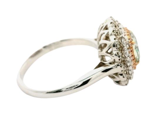 Surrounding the center stone is a luxurious diamond halo setting, enhancing the presence and fire of the ring. The piece is meticulously crafted in solid 18K white gold, providing a refined contrast that highlights the diamond’s rare fancy color while ensuring durability and long-lasting elegance.