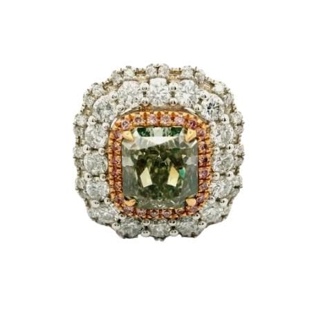 The center diamond displays a captivating and rare blend of dark gray, greenish, and yellow hues, offering exceptional depth and brilliance. Expertly cut in a cut-cornered rectangular modified brilliant style, the diamond sparkles beautifully from every angle, making it a striking and unique alternative to traditional white diamonds.