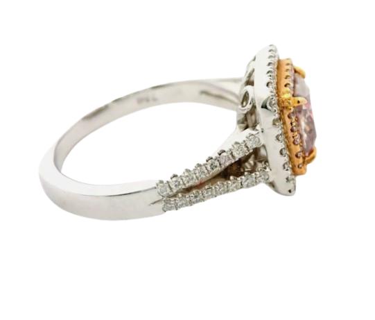 Encircling the center diamond is a refined halo of sparkling natural diamonds, enhancing its size and brilliance. The ring is meticulously crafted in solid 18K white gold, offering a sophisticated contrast that allows the fancy color diamond to truly shine. The split-shank design adds elegance, balance, and durability to this timeless piece.