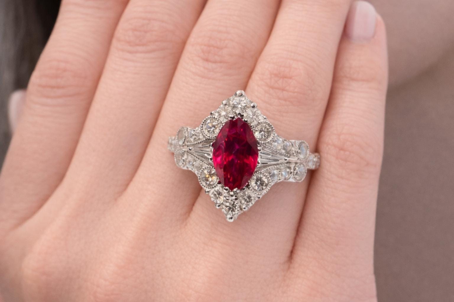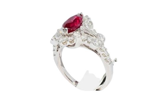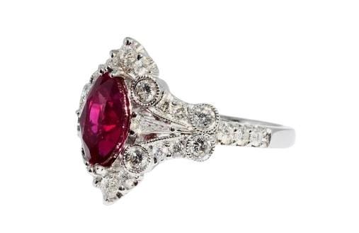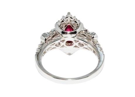 Surrounding the center ruby are natural high-quality diamonds, carefully selected to enhance the ruby’s fire and elegance without overpowering its presence. The ring is expertly crafted in solid 18K white gold, offering a refined and timeless setting that allows the ruby’s color to take center stage while ensuring exceptional durability and comfort.