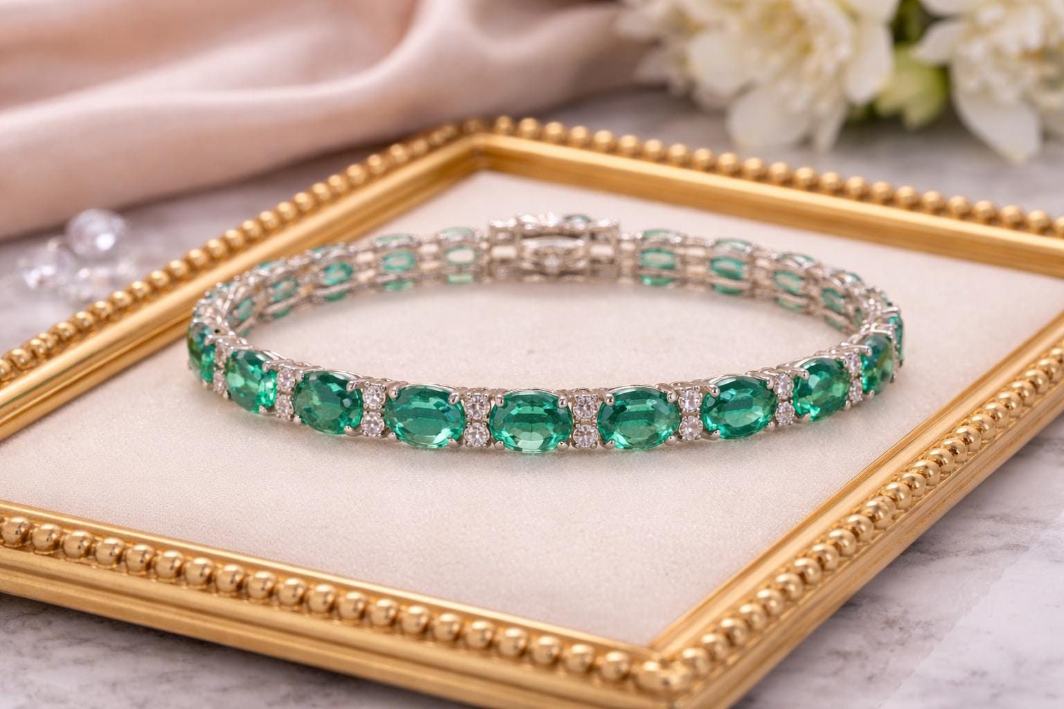 The vibrant emeralds display a rich, captivating green hue, carefully selected and matched for color and brilliance. Each emerald is securely set to allow maximum light and sparkle, while natural diamonds are delicately placed between the emeralds to enhance their fire and add refined brilliance.