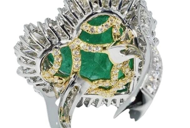 Surrounding the center stone, meticulously set natural diamonds create a dazzling frame that amplifies the emerald’s size and brilliance. Every detail of this ring reflects master craftsmanship, making it a true collector-grade jewel worthy of the most discerning buyer.