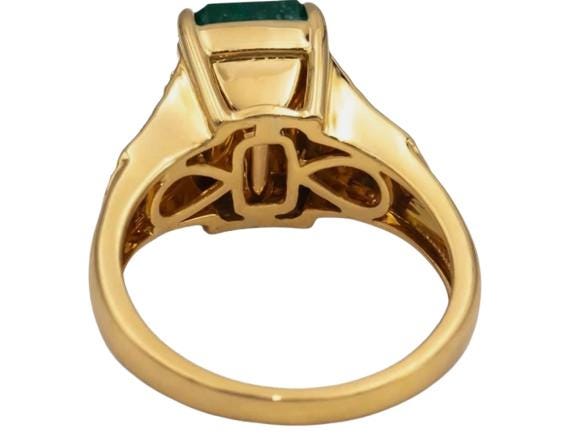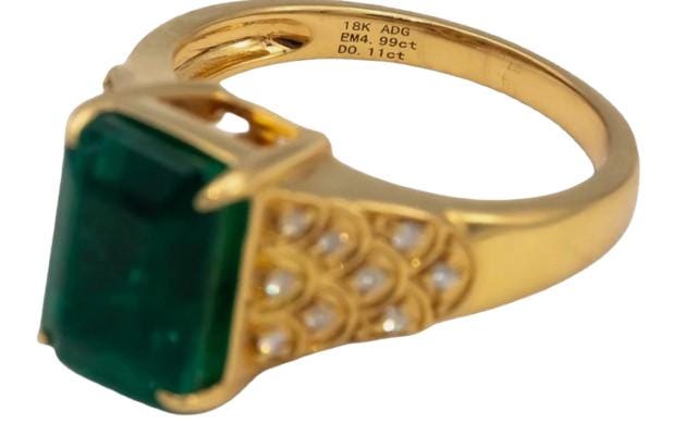 The striking emerald displays a rich, vibrant green hue that symbolizes luxury and sophistication. Its impressive size and classic emerald cut create a commanding presence, while the surrounding diamonds add brilliance and refinement without overpowering the center stone. The warm tone of 18K yellow gold enhances the emerald’s natural color, giving the ring a regal and timeless appeal.