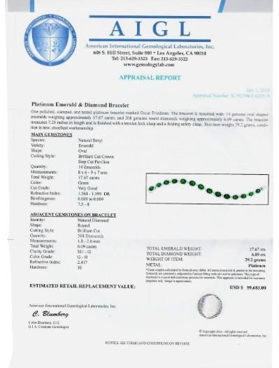 An extraordinary expression of timeless elegance and refined craftsmanship, this magnificent bracelet features 17.67 carats of natural emeralds beautifully complemented by 6.09 carats of sparkling natural diamonds, all meticulously set in solid platinum. Designed for collectors and connoisseurs of fine jewelry, this bracelet is a true statement of luxury and sophistication.