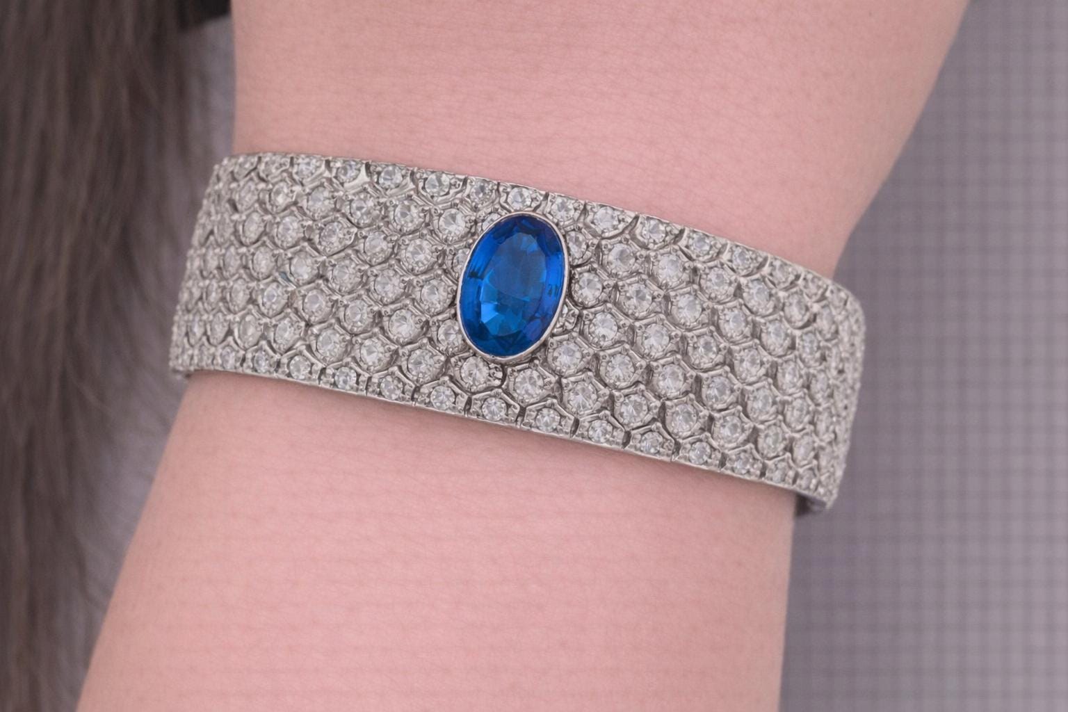 An exceptional authentic Art Deco bracelet from circa 1920, this magnificent French jewel showcases the refined geometry and luxurious craftsmanship that defined the golden age of high jewelry. Featuring natural Burma sapphires paired with Old European cut diamonds, this bracelet is a rare and timeless collector’s piece with unmistakable historic charm.
