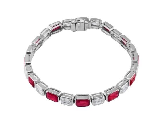 An exceptional statement of timeless elegance and rarity, this exquisite bracelet features 12.69 carats of natural emerald-cut red rubies from Mozambique, masterfully set in solid Platinum 950. Designed for discerning collectors and lovers of fine jewelry, this bracelet embodies sophistication, strength, and enduring value.