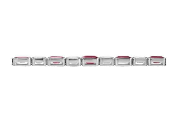 The emerald-cut rubies display a rich, vibrant true red hue, prized for their depth of color, clarity, and brilliance. Mozambique rubies are celebrated worldwide for their exceptional quality, often rivaling the finest historic sources. Each gemstone is carefully matched and precision-cut to enhance natural fire and symmetry, creating a harmonious and luxurious visual flow around the wrist.