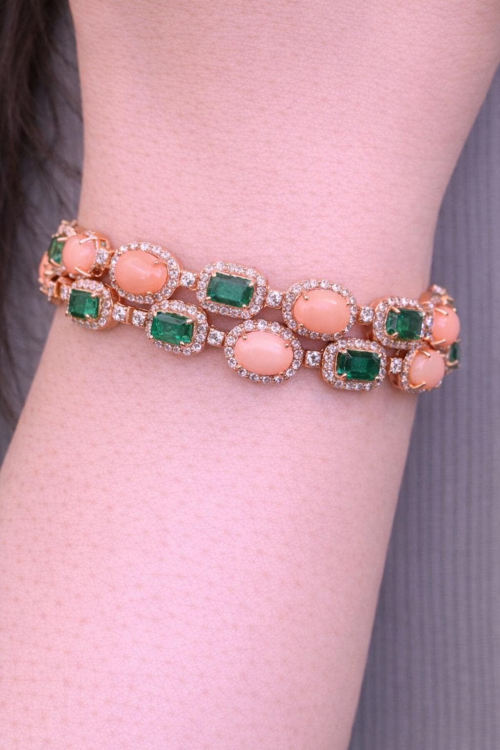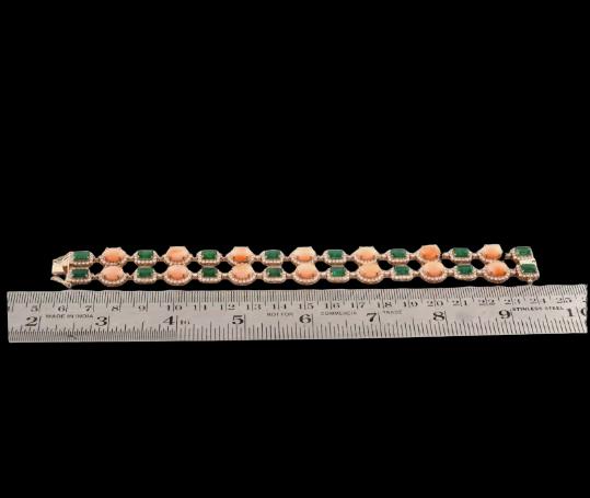 With an impressive total carat weight of 33.15 carats, each gemstone is carefully selected for its brilliance, color saturation, and natural beauty. The emeralds display the deep, velvety green hue Zambian stones are renowned for, while the coral adds a bold, warm contrast. Accented by finely set diamonds, the bracelet delivers exceptional sparkle and sophistication from every angle.