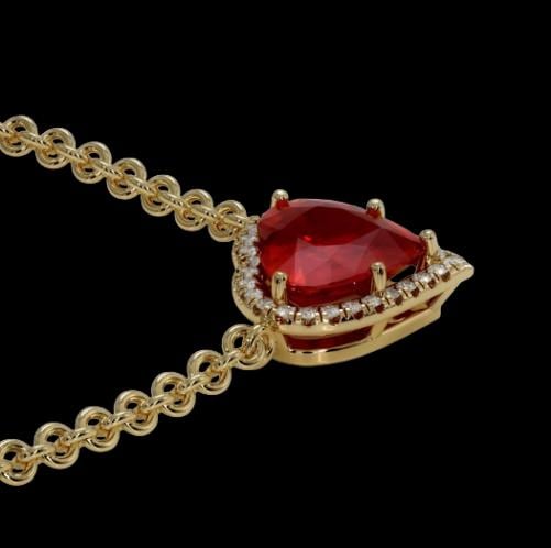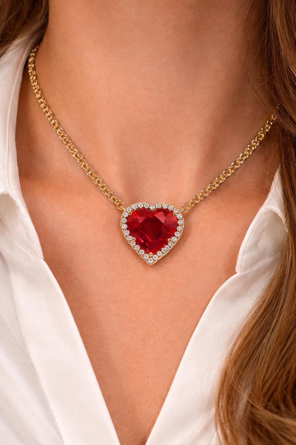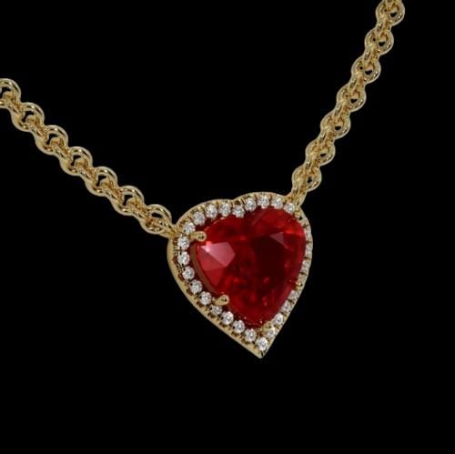 The heart-shaped ruby is expertly faceted to maximize brilliance and fire, creating a captivating centerpiece that symbolizes love, strength, and elegance. Set in warm yellow gold, the ruby’s intense color is beautifully enhanced, making this necklace a true statement of luxury and refined taste. Perfectly balanced and gracefully suspended, it rests elegantly at the neckline for a striking yet sophisticated look.