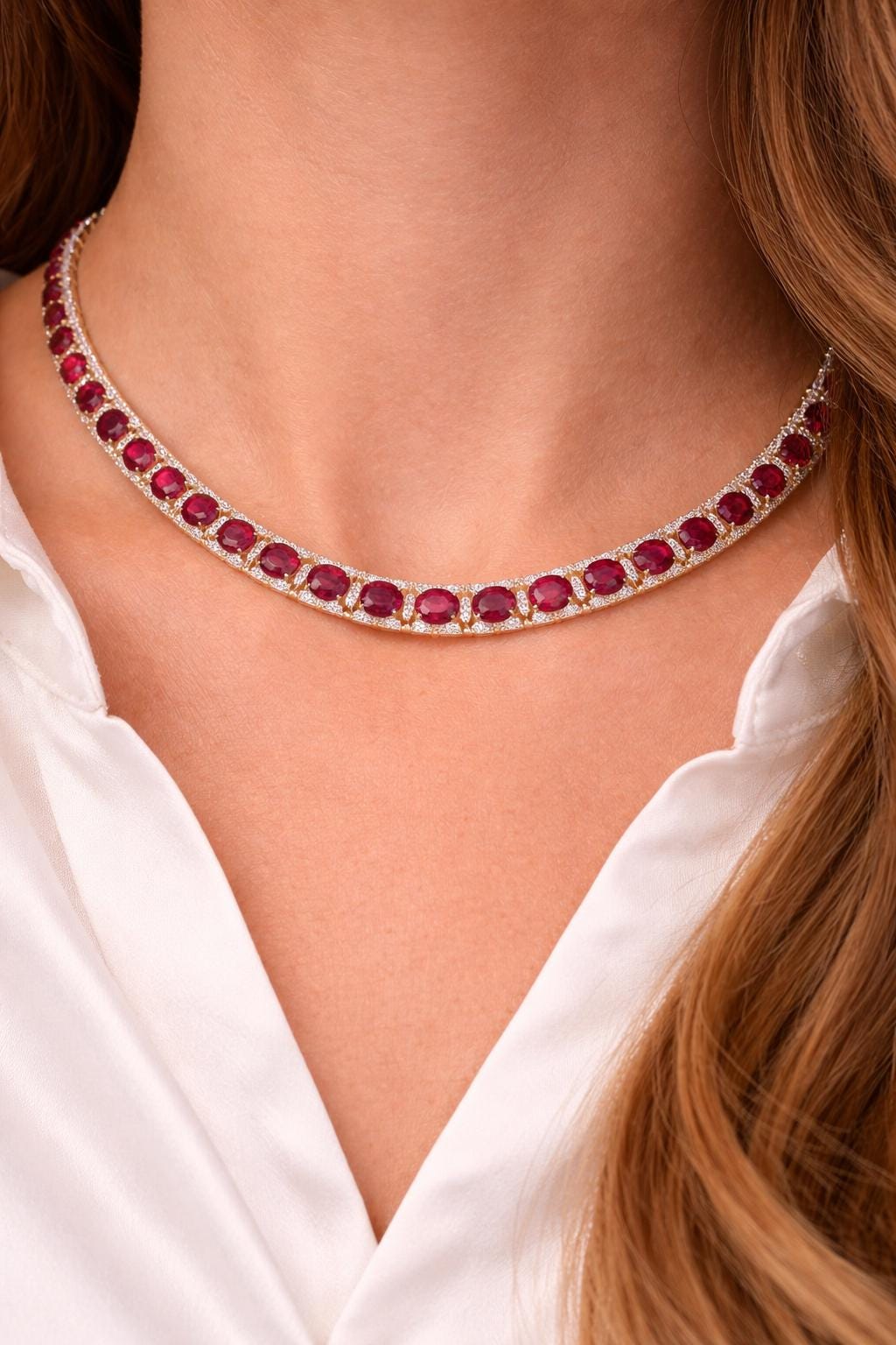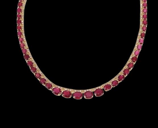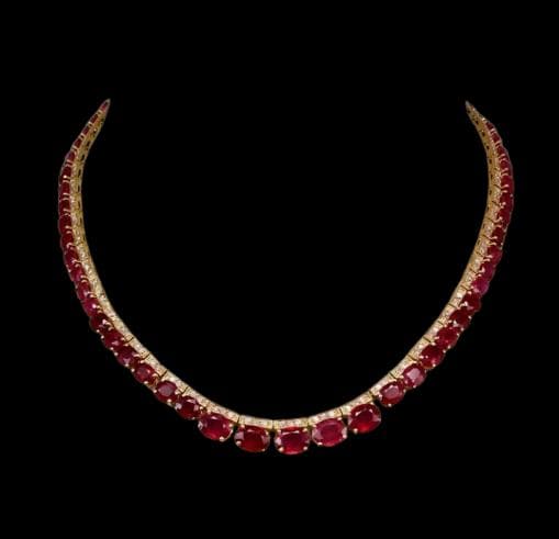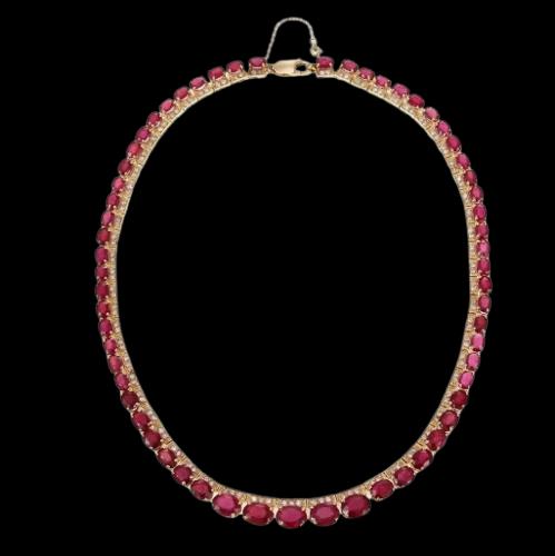 Designed in a graceful graduated collar silhouette, the necklace features vibrant natural rubies beautifully accented by sparkling diamonds, creating a harmonious balance of color and brilliance. The graduated design allows the necklace to sit elegantly along the neckline, offering both visual impact and comfortable wear. The warm tone of yellow gold enhances the depth of the rubies while amplifying the diamonds’ radiant sparkle.