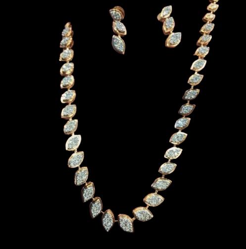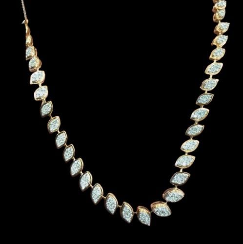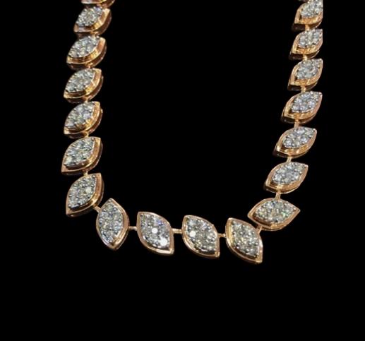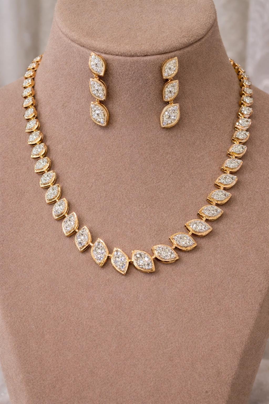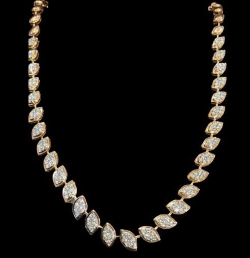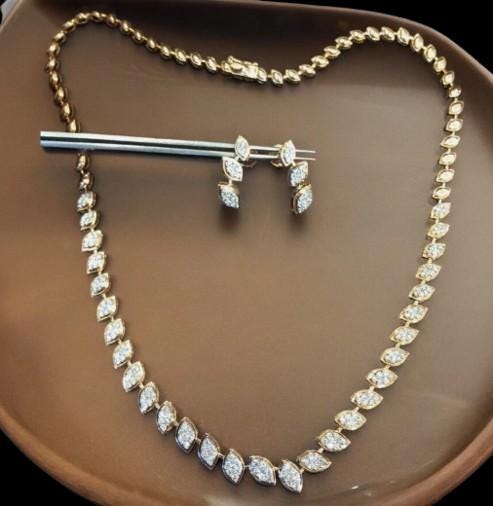 Each diamond is carefully selected and expertly set to maximize brilliance and fire. The necklace drapes gracefully along the neckline, creating a sophisticated and flattering silhouette, while the coordinating earrings mirror the same elegant design for a perfectly balanced, polished look. The warm glow of 14K gold enhances the diamonds’ natural brilliance, making this set ideal for both everyday luxury and special occasions.