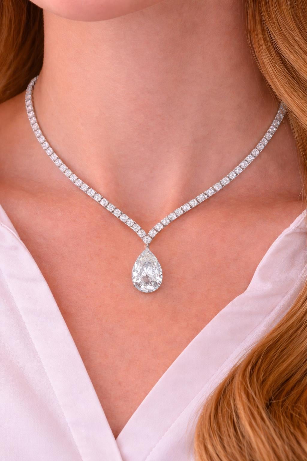 • Gemstones: Natural Diamonds • Diamond Shapes: Pear Shape & Round Brilliant • Diamond Quality: H Color / SI Clarity • Total Carat Weight: 23.28 CT • Metal: Solid 18K White Gold • Necklace Length: 17 Inches • Style: Dangling / Drop / Statement Necklace • Setting: Secure handcrafted prong setting • Condition: Brand New