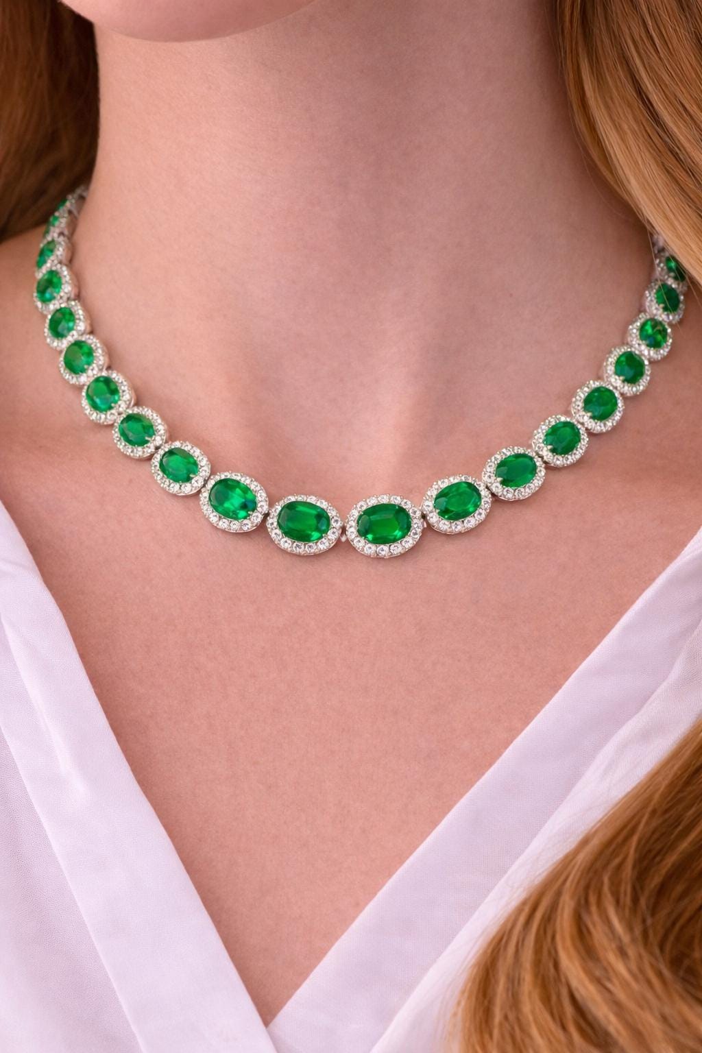• Total Carat Weight: 42.11 CT • Gemstones: Natural Emeralds & Natural Diamonds • Metal: Solid 18K White Gold • Design: Emerald Halo Necklace • Style: Luxury | Statement | High Jewelry • Finish: High Polish for Maximum Brilliance