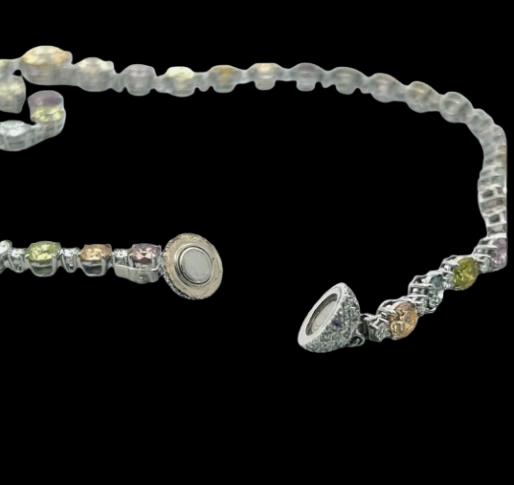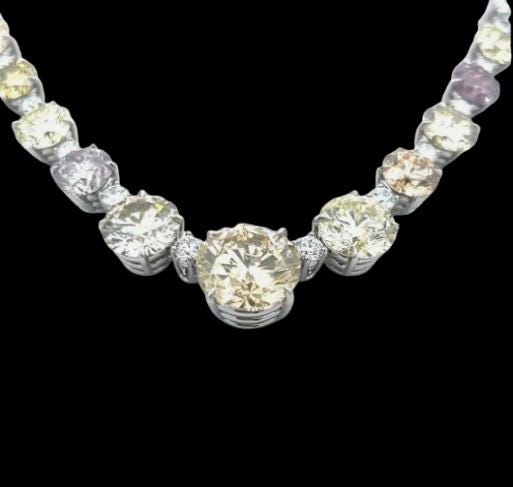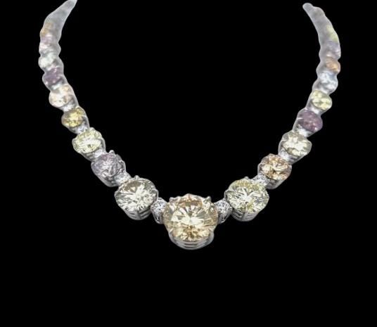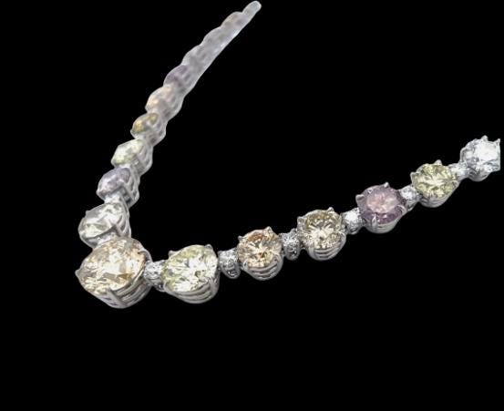 The necklace displays a harmonious blend of natural fancy diamond colorsâsubtle yellows, champagne tones, soft pinks, and delicate greensâeach expertly selected and arranged in a classic Riviera style for seamless brilliance and balance. Set in cool, lustrous platinum, the diamonds radiate maximum sparkle while offering unmatched durability and prestige.
