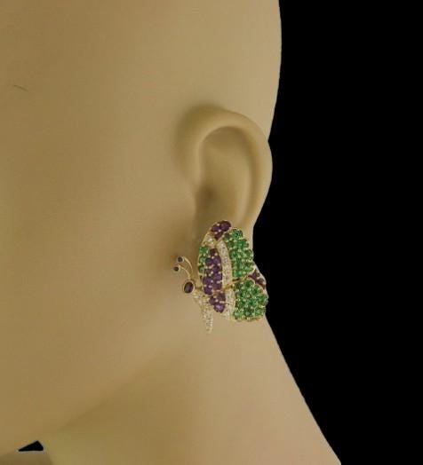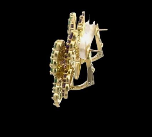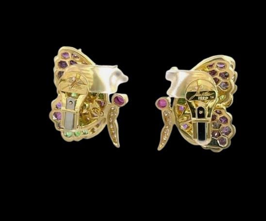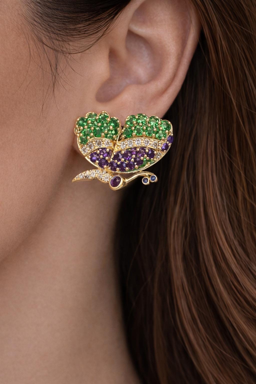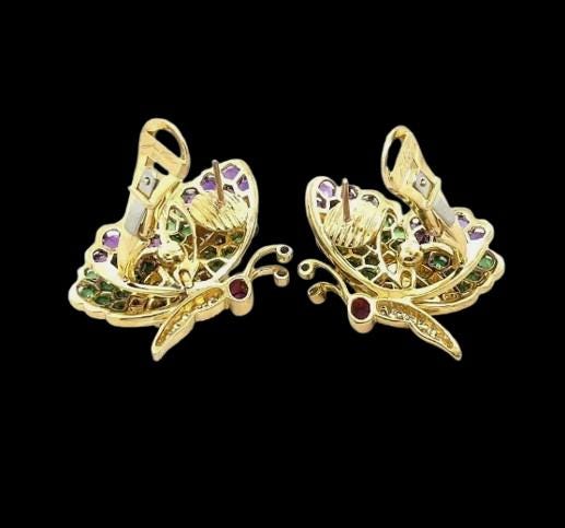 Each butterfly is meticulously set with sparkling natural diamonds and a rich combination of colorful gemstones that create striking contrast and brilliance. The warm glow of solid 18K yellow gold enhances every detail, making these earrings a captivating statement piece for both special occasions and elegant everyday wear.