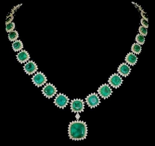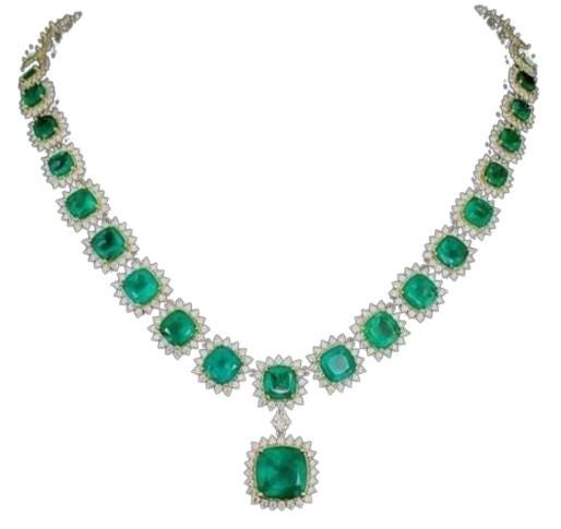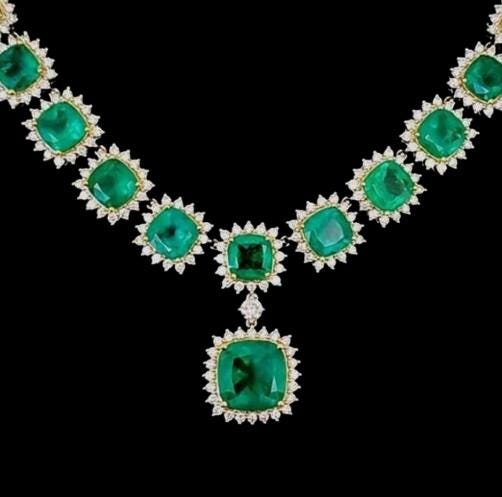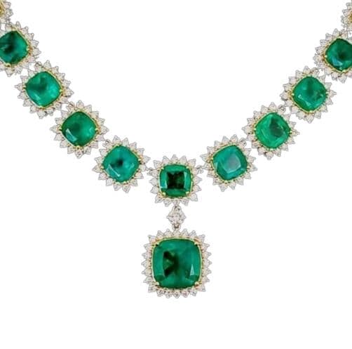✔ Total Carat Weight: 63.32 CT (Emerald + Diamond) ✔ Gemstones: AAA Natural Emeralds (Oval & Round) ✔ Accent Stones: Brilliant Natural Diamonds ✔ Metal: 18KT Two Tone Gold (Yellow + White Gold look) ✔ Style: Emerald Diamond Halo / Tennis Necklace / Statement Necklace ✔ Setting: Secure prong-set halos for maximum sparkle ✔ Finish: High polish luxury shine